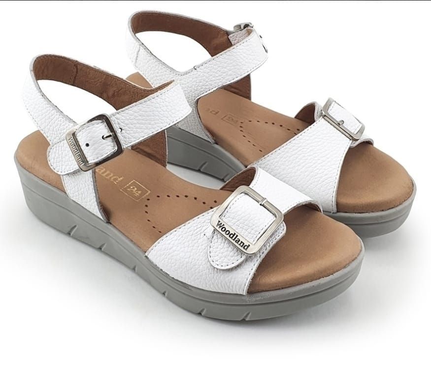 Sandalia de cuero con doble hebilla, color blanco , forrada en cuero , plantilla de latex con oliva en el metatarsoforrada en cuero vacuno .Base inyectada de goma , altura 5 cm en el talón y delante 2,5 cm